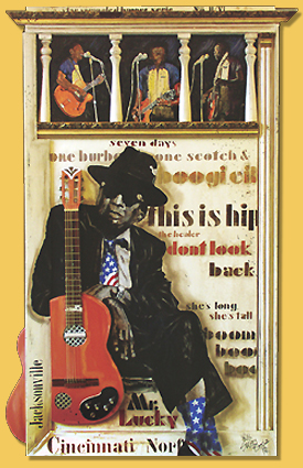 85 X 200 cm. Collage auf Holz, Portrait von J. L. Hooker,